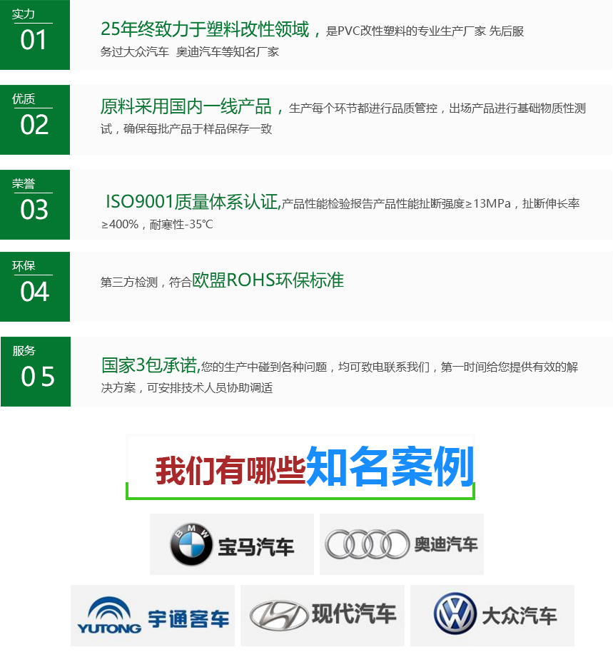該產(chǎn)品是以聚氯乙烯(PVC)、丁晴橡膠(NBR)為主要原料,根據(jù)汽車配件類產(chǎn)品的要求,以及不同客戶的不同需求,加入改性劑、增塑劑、耐寒劑等加工助劑,經(jīng)造粒而成,該產(chǎn)品具有表面光潔度好、高彈性、耐寒、強(qiáng)度高、耐磨、耐老化、光潔度好等優(yōu)點(diǎn),主要應(yīng)用于汽車裝飾條、汽車水切條、汽車擋水條、汽車門窗封條、汽車空調(diào)回水管等各類產(chǎn)品。